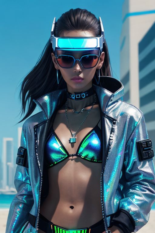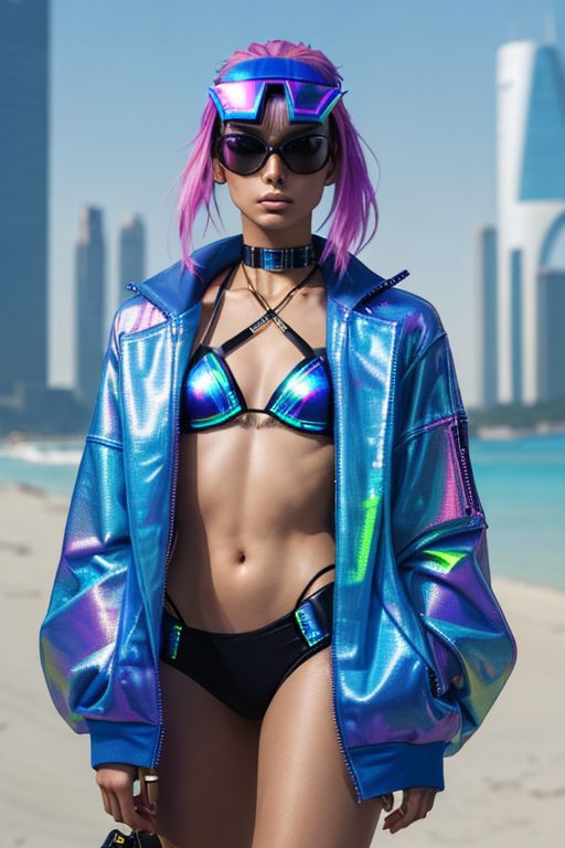 The bikini line include cyberpunk-inspired accessories like visor sunglasses, metallic chokers, or holographic beach bags with embedded tech features.